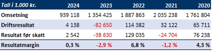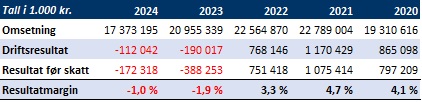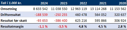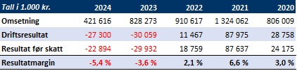 Omsetning ble tilnærmet halvert fra 828 millioner kroner i 2023 til 421 millioner kroner i 2024.