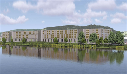 Anlegget sett fra utløp Drammenselva med  grøntsoner og fasader som ifølge Bertel O. Steen skal dempe «p-hus-inntrykket».
