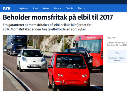 «Frp garanterer at momsfritaket på elbiler ikke blir fjernet før 2017. Momsfritaket er den første elbilfordelen som ryker.»