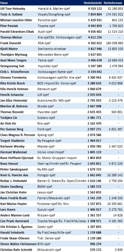 Toyota Norge-sjef Piotr Pawlak hadde en nettoinntekt på 4,9 millioner i 2024, fulgt av Audi-sjef Harald Edvardsen-Eibak og den nye Kia-sjefen Thomas Meiner.