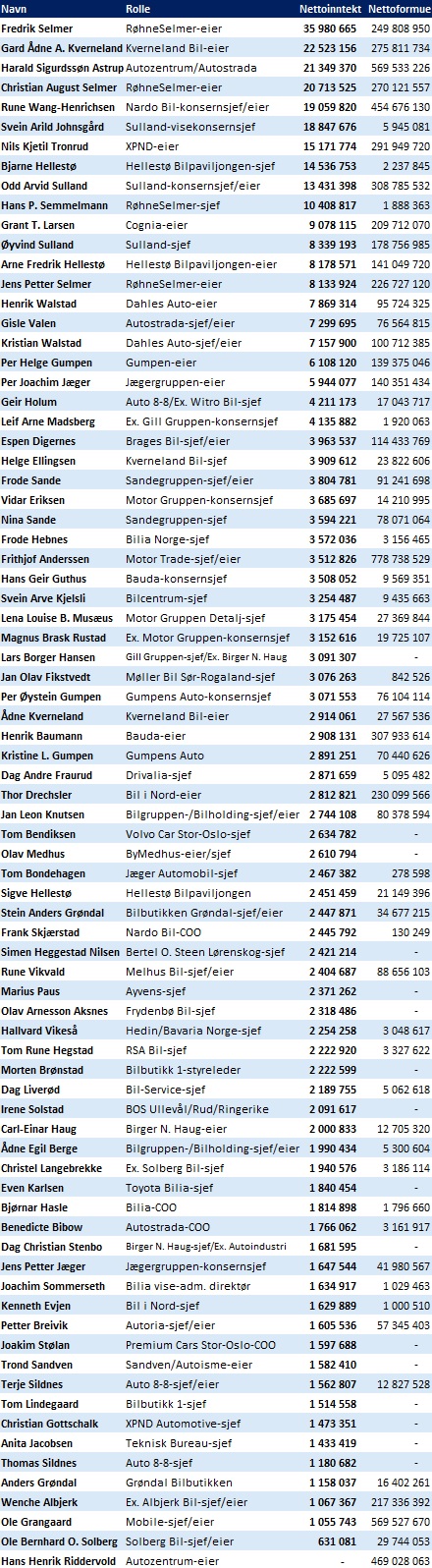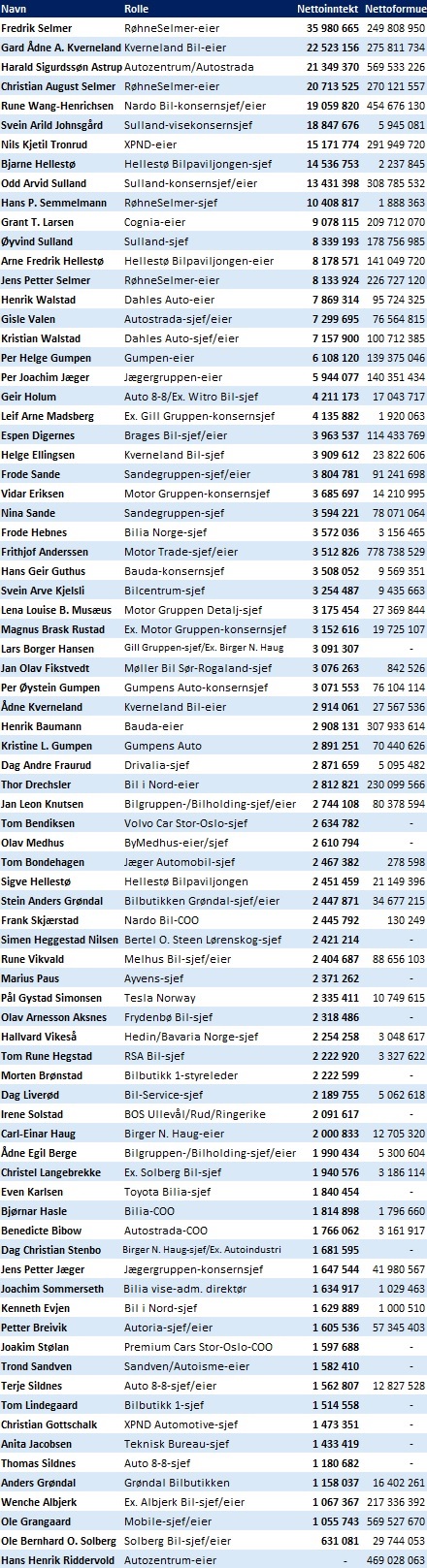 De forskjellige eierne av Møller- og Bertel O. Steen-konsernene figurerer høyt på formues- og inntektslistene, men i dagens lister er det fokus på de ansatte lederne – og mer «lokale» forhandlereiere.
