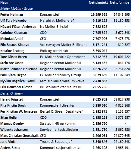 Samlet nettoinntekt for syv av dagens åtte personer i Møller Mobility Groups konsernledergruppe utgjorde over 63,9 millioner kroner i fjor.