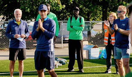 Her er Møller Mobility Groups konsernsjef Petter Hellman (t.h.) og initiativtaker til Born to Play Harmeet Singh (foran) på stiftelsens fotballcamp sommeren 2025 sammen med Paul Hegna. Foto: Born to Play