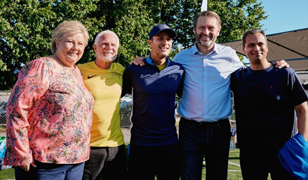 Celeber visitt på fotballcampen på Furuset i fjor sommer: Fra venstre daværende Høyre-leder og nå stortingsrepresentant Erna Solberg, Paul Hegna, Harmeet Sinhg, byrådsleder Eirik Lae Solberg og stortingspolitiker Mudassar Kapur. Foto: Born to Play.