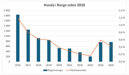 I 2024 og 2025 ble salgsmålene nesten nådd, da det ifølge OFV Statistikk ble registrert henholdsvis 758 og 763 nye Honda i Norge – blant annet ved hjelp saftige priskutt.
